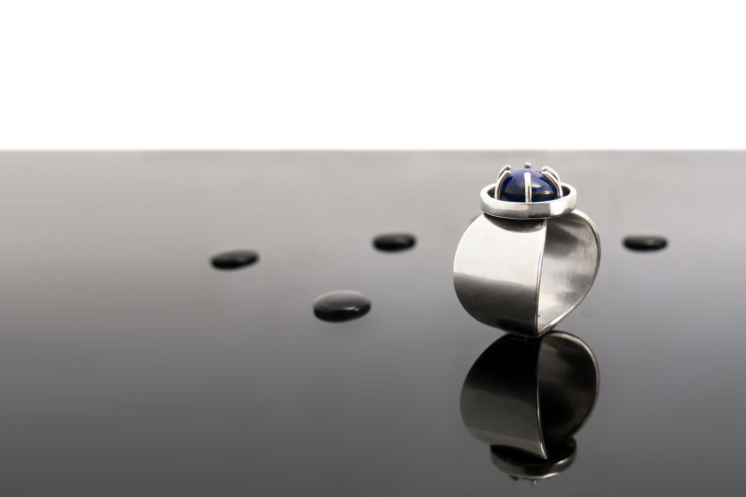 Prstan je izdelan iz srebra 925 in kristala safirja. Oblikovan je preko računalniškega programa, nato 3D printan, ulit v srebro in ročno dokončan.